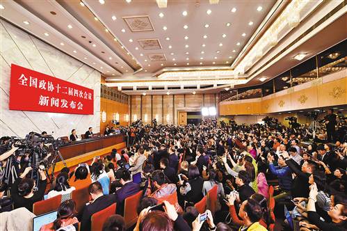 3月2日,全国政协十二届四次会议新闻发布会在北京人民大会堂举行,大会新闻发言人王国庆介绍会议有关情况并回答中外记者提问。新华社记者 李鑫 摄