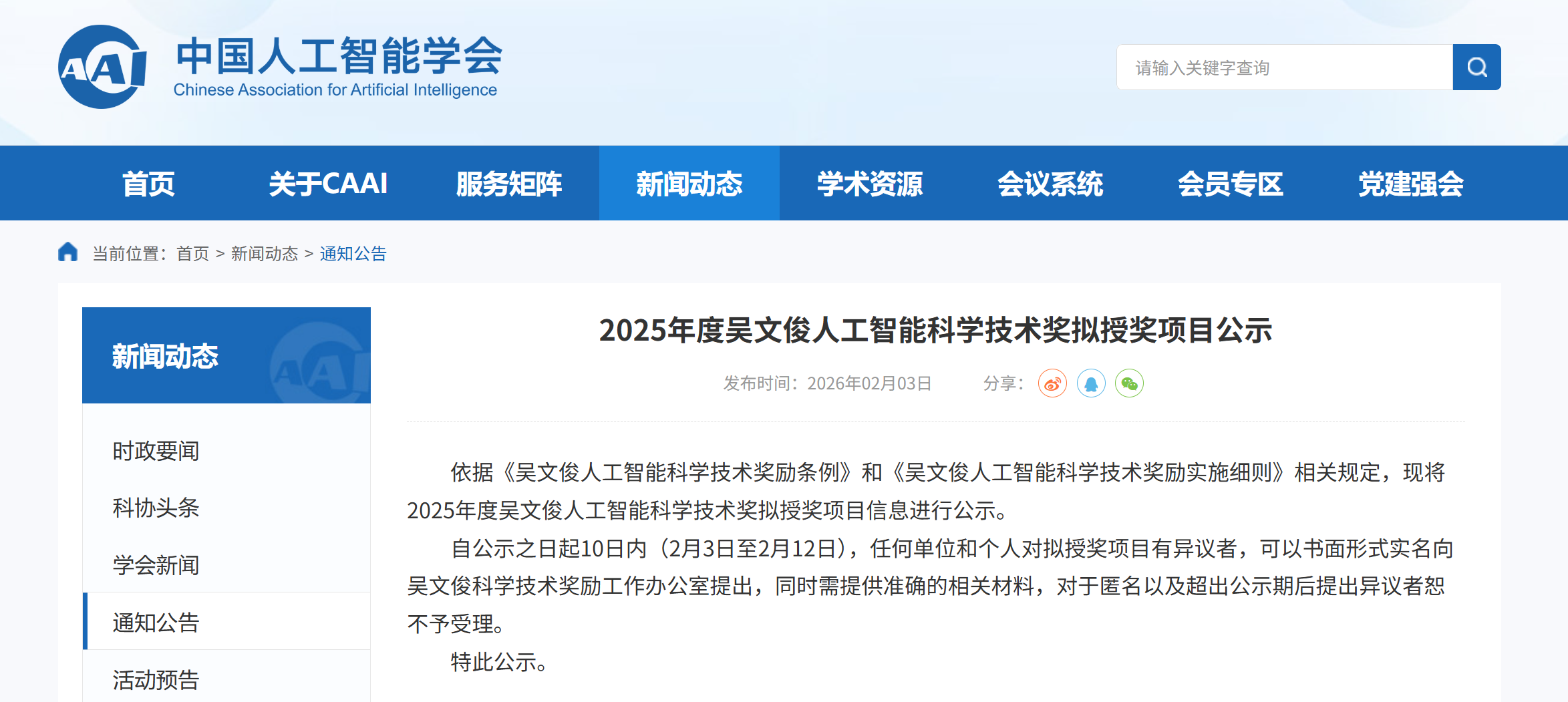 2月3日,中国人工智能学会网站发布《2025年度吴文俊人工智能科学技术奖拟授奖项目公示》。