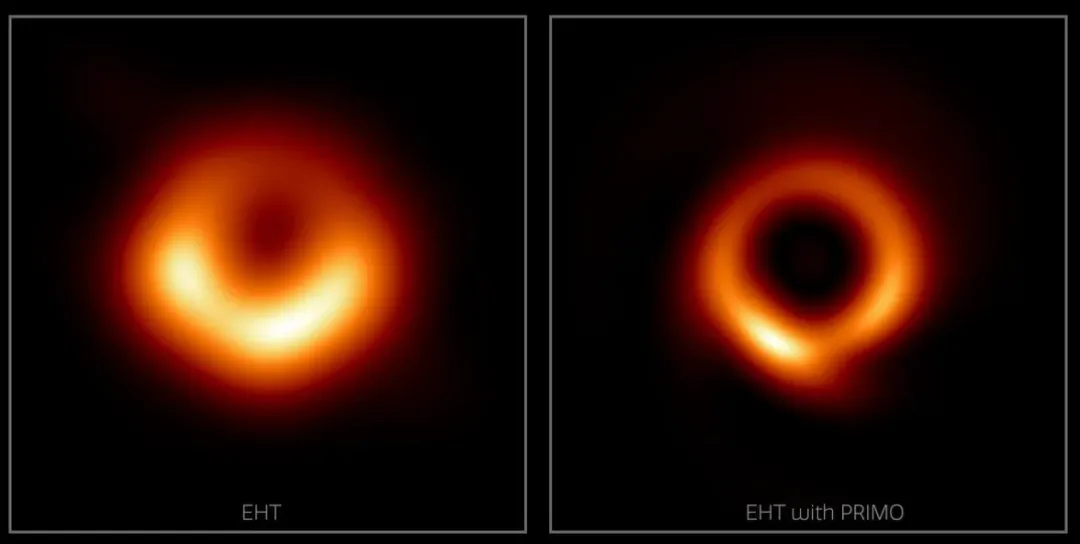 再比如2019年的那张震惊世界的黑洞照片(左下)。2023年,在AI模型PRIMO的帮助下,科学家优化了这幅图像(右下)。这样更高分辨率的图像,对于科学家更准确地估算黑洞的质量、大小以及物质消耗速率能起到帮助。