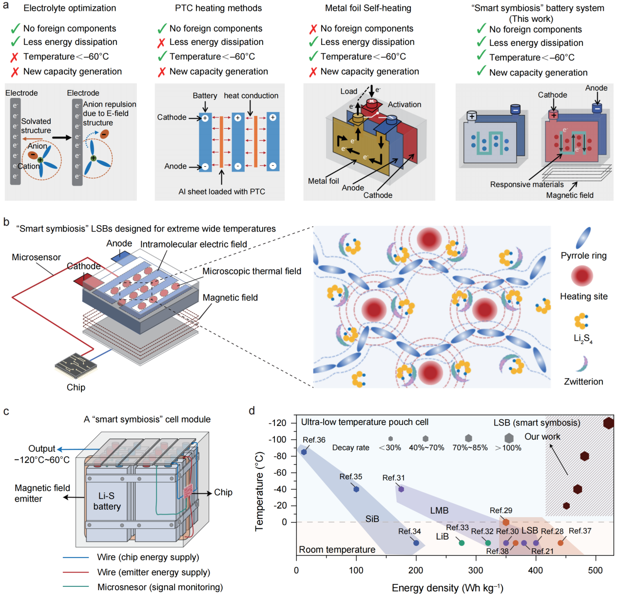 团队跳出传统材料改性思维,打造“智能共生”系统,集成微型温度传感器、智能控制芯片与磁响应正极材料。传感器实时捕捉温度,芯片动态调控交变磁场,特制正极对磁场响应,基于多物理场协同效应,可使电池在低温环境中能够像生物一样自适应自调节,突破低温转化壁垒。