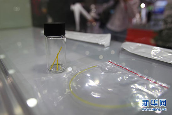 这是复旦大学展出的应用于“光控微流体技术”的“微管执行器”(11月7日摄)。