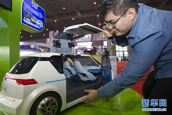 11月7日,同济大学的参展人员在展示一款可实现拆解重构、变四座车为两座车的汽车模型。