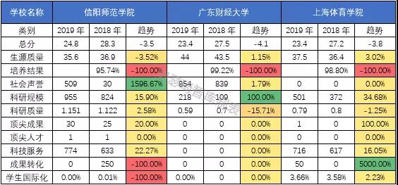 无独有偶,和排名上升的顶尖大学呈现一样的规律,排名上升幅度最大的三所大学也在科技服务(企业科研经费·千元)这一指标上有较为明显的上浮。而排名下降幅度最大的三所大学很多数据都是0或者空着,尤其是培养结果这一栏,三所大学2019年的数据显示为空。拿上海体育学院为例,其除了培养结果这一指标外其余指标相对去年都是上升或者持平,但是总分却少了将近4分,这和缺失的培养结果数据必然有直接的联系。榜单中200名之后的高校很多都面临这个共性问题,就是很多数据是没有的,这就导致了其中某一项指标对该校的整体得分可能产生决定性影响。并且和顶尖大学的指标变化趋势对比就会发现,这些变化幅度较大的高校有些指标变动的幅度也是非常夸张。这些问题都难以避免的会造成对大学评价的偏颇,也会向大众传递错误的信息。