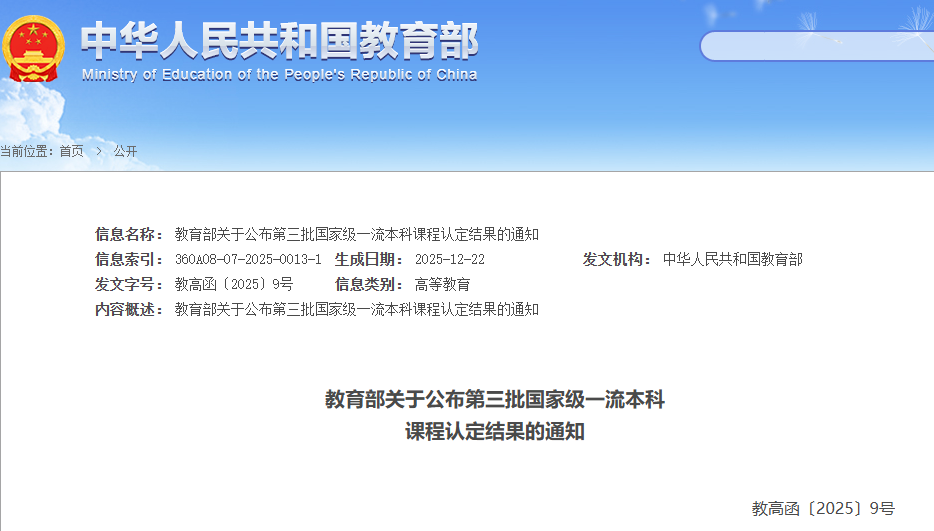 1月22日,教育部发布《教育部关于公布第三批国家级一流本科课程认定结果的通知》。