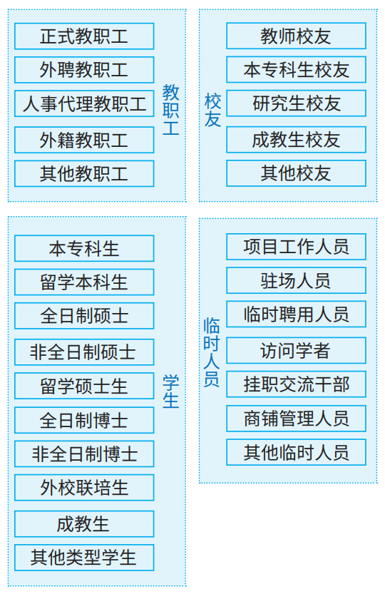 高校人员数量多且类型复杂,对他们的身份信息进行合理规划和分类有助于实现便捷、高效的精准管理。梳理并精准归类高校师生的身份信息,同时通过建设与组织机构关联的人员的身份库以完成管理,可实现对各个业务平台系统的精准服务。高校人员的身份可分为三类:正式教职工、正式学生以及其他人员。其他人员主要指与学校有业务关系的人员。正式教职工和正式学生都有明确的管理机构和管理系统,而其他人员身份类型复杂,为实现统一管理需进行分类,具体分类如图2所示。