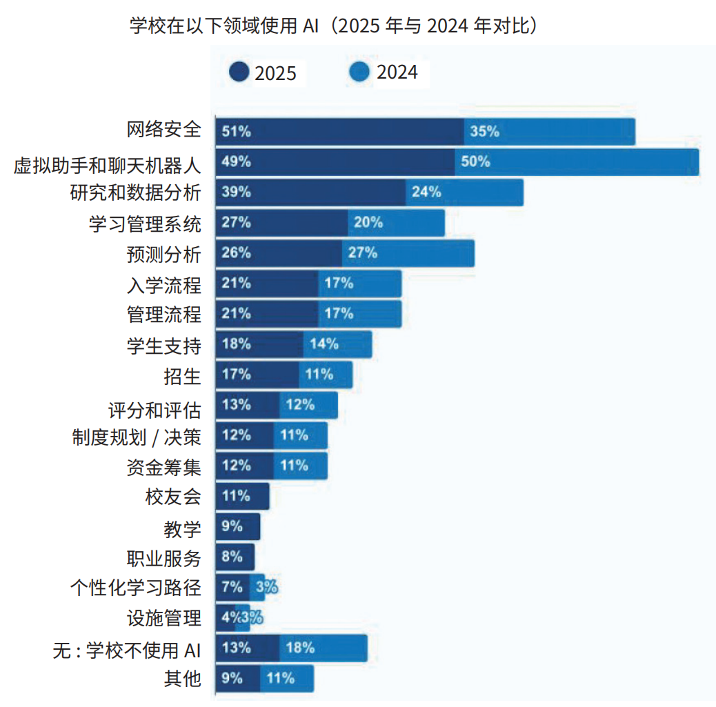 与其他部门就AI问题的协同沟通相对顺畅。三分之二的CTO(66%)同意,IT与教务部门之间存在有效的沟通渠道,可就AI政策及其他关键议题展开协作。63%的受访者表示,学校领导正积极参与AI相关讨论并认为此事至关重要。但仅35%的CTO认为所在学校正在妥善应对AI的崛起,只有19%的CTO认为整个高等教育正在应对AI的崛起。同时,32%的CTO部分认同,所在大学对AI的依赖程度较前一年有显著提升。学校应用AI的主要领域是网络安全(51%)和虚拟助手及聊天机器人(49%),其中公立大学的CTO尤其倾向于后者。