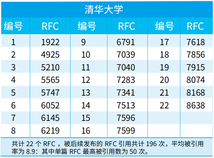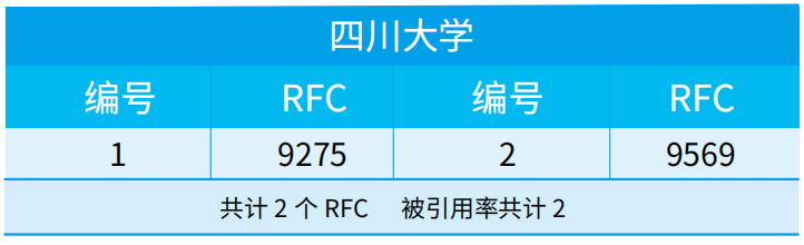 IETF负责制定互联网标准RFC。当前,全球一共有九千多个RFC,其中,第一作者来自中国大陆的有209个(其中有3个未显示第一作者单位)。根据RFC INDEX网站提供的资料,我们整理了由中国大陆作者牵头发布的所有RFC信息,按照第一作者所在单位进行分类,并统计了该单位RFC的总引用率(仅统计被其他RFC引用次数,被草案引用不纳入统计)。