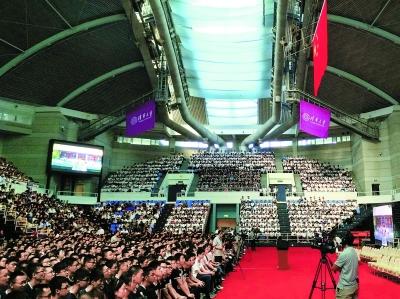 校长邱勇面对全体新生发表了题为《向美而行》的发言,邱勇说,年轻的你们如此优秀,作为校长感到无比高兴和自豪,“我希望某一天在校园里骑车与你们偶遇,在游泳馆里看见你们矫健的身姿。我更希望,经过大学四年的学习生活,你们具有健全人格、宽厚基础、创新思维、国际视野和社会责任感。”