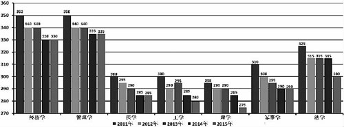 从图4可以看出,从2011年到2015年,学术型硕士各学科门类中,经济学、管理学、医学、法学等学科的录取分数线总分,均处于持续降低的趋势,根据教育部发布的《全国硕士研究生招生考试考生进入复试的初试成绩基本要求》显示,仅有教育学、历史学两个学科复试分数线近五年来保持上涨趋势。