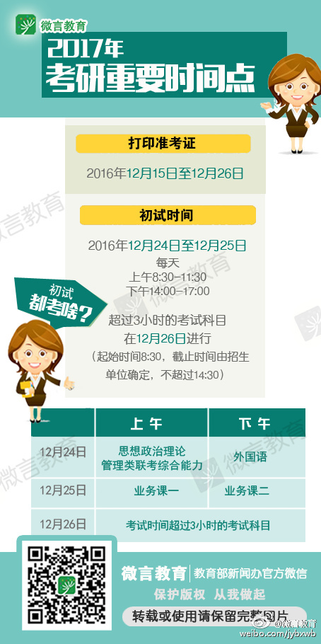 2017研考进入倒计时!考前要注意这些事!距离研考还有不到三周,对于考研的同学来说,一定要记得再次确认准考证打印以及笔试时间,确认身份证等个人证件,保管好学信网账号和密码。在复习的同时,还要注意调整自己的作息,合理安排时间进行放松,多给自己一些积极的心理暗示。为考研的同学转发加油!