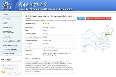 The international students at UIBE For more information about The University of International Business and Economics, please see http://u.cucas.cn/HomePage/36/ Want to learn more detail information about programs, please click http://school.cucas.edu.cn/HomePage/36/ProgramIndex-36-5-1.shtml About CUCAS CUCAS (http://www.cucas.edu.cn/) offers a powerful, professional and one-stop online application service to China's Universities. |