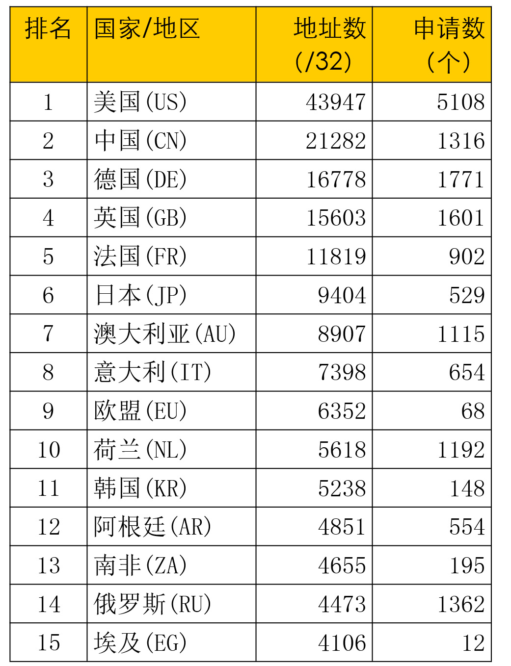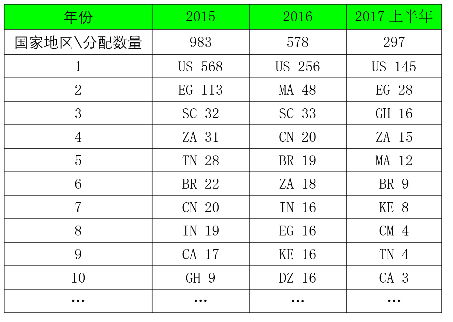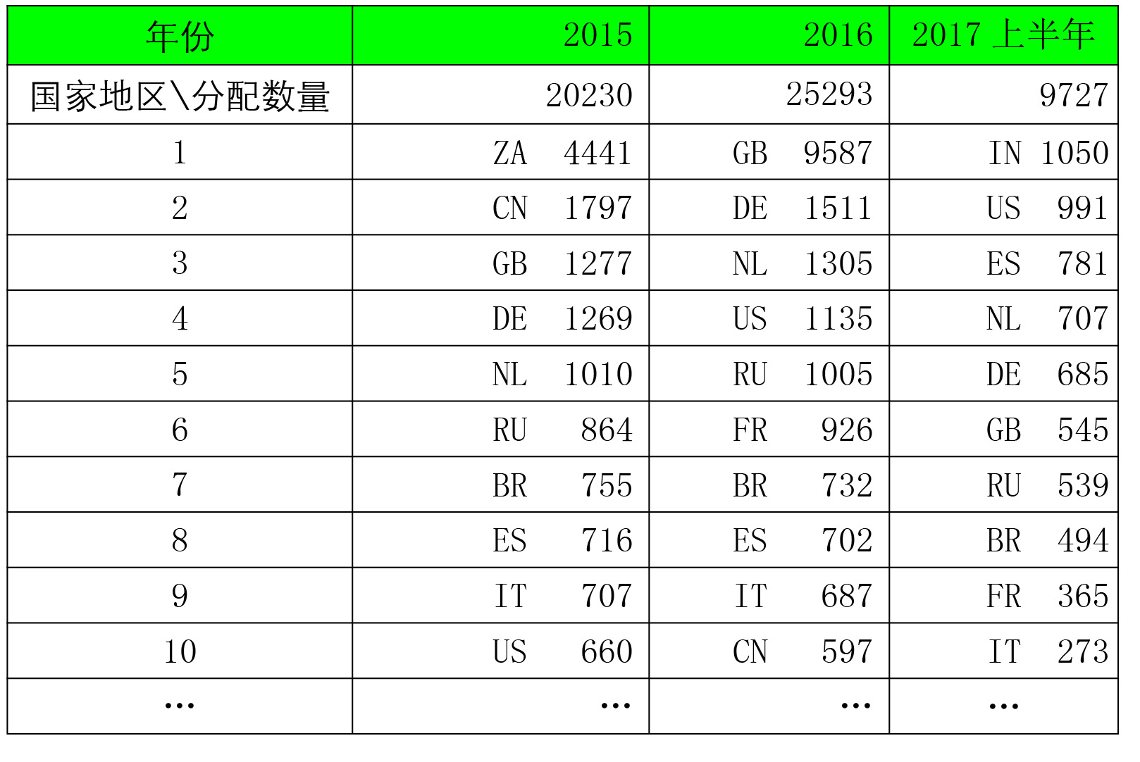 2017上半年全球IPv4地址分配数量为297B。2017上半年获得IPv4地址数量列前三位的国家/地区,分别为美国145B,埃及28B,加纳16B。