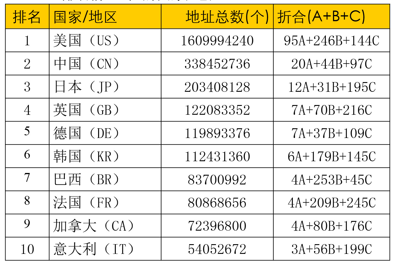 截至2017年6月底,全球IPv4地址分配总数为3652446776,折合217A+179B+234C,排名前10位的国家/地区: