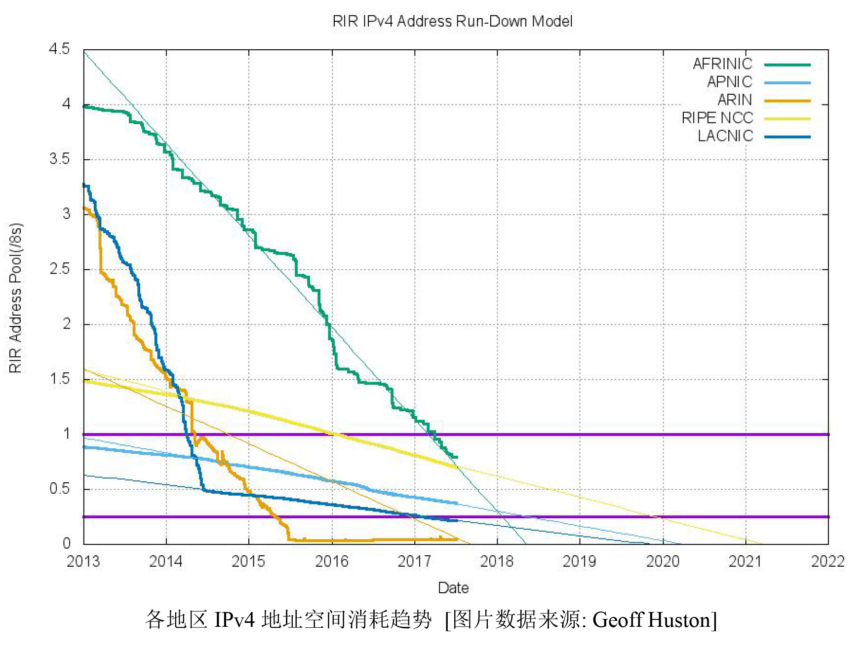 各地区IPv4地址空间耗尽时间及剩余地址数量(单位:/8或A):