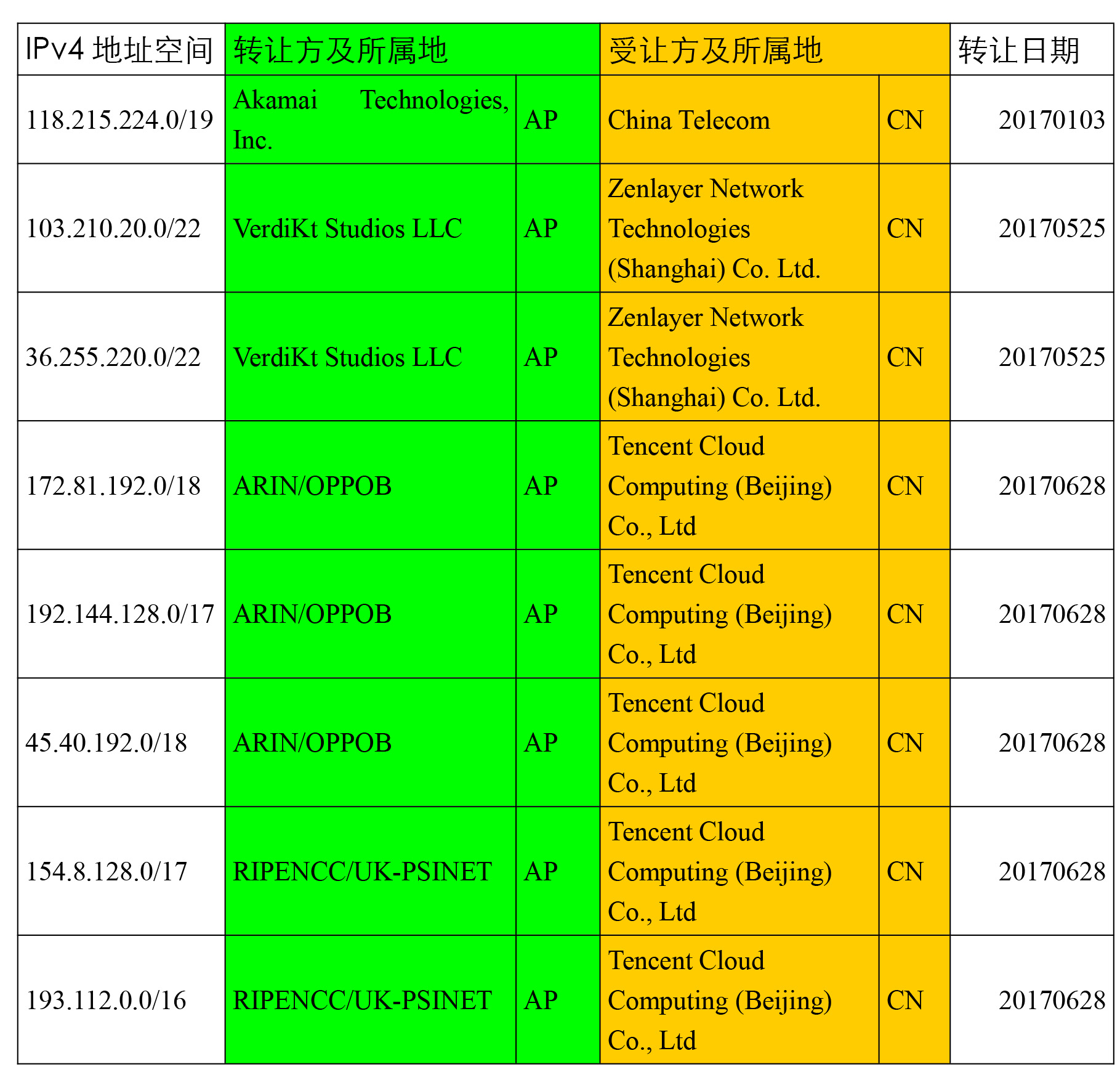 2017上半年,亚太地区有211条IPv4地址转让记录,其中跨地区的转让交易有30条记录,181条是在亚太地区内部转让,其中国家/地区内部转让的有144条,比如中国53条,印度42条,澳大利亚15条,巴基斯坦9条等,其中有8个从境外转让到中国境内的地址块。中国境内的记录示例:
