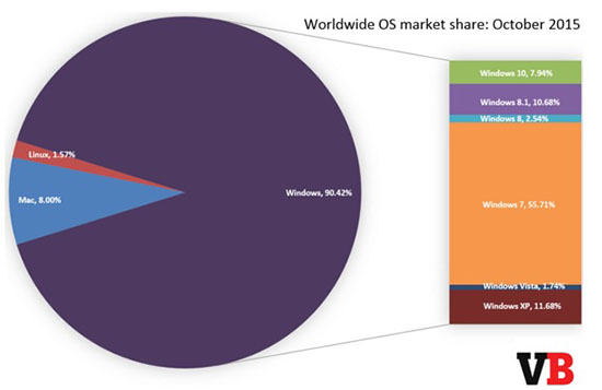 尽管Windows10的市场份额肯定会继续增长,但是Windows7很有可能在很长时间内保持其最受欢迎操作系统的地位。Windows7在2012年9月超越WindowsXP成为微软第一大操作系统,随后份额稳步增长。今年10月,Windows7份额最终降低到了年初以下水平,该系统在今年1月份时的份额为55.92%。