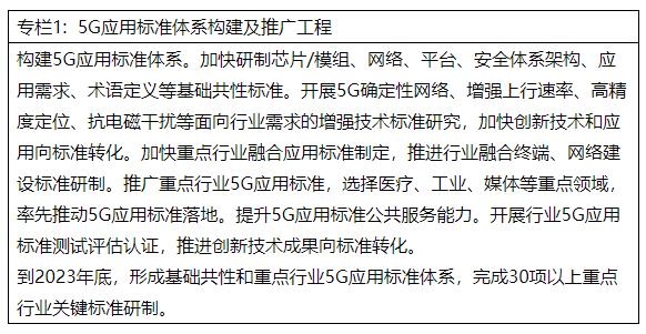 第二,构建标准体系。系统推进重点行业5G融合应用标准研究,加快制定基础共性标准、融合设备标准、重点行业解决方案等5G应用标准体系研制。