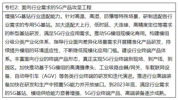 9. 5G+工业互联网。推进5G模组与AR/VR、远程操控设备、机器视觉、AGV等工业终端的深度融合,加快利用5G改造工业内网,打造5G全连接工厂标杆,形成信息技术网络与生产控制网络融合的网络部署模式,推动“5G+工业互联网”服务于生产核心环节。围绕研发设计、生产制造、运营管理、产品服务等环节,聚焦“5G+工业互联网”发展重点行业,打造典型应用场景,持续开展“5G+工业互联网”试点示范,支持5G在质量检测、远程运维、多机协同作业、人机交互等智能制造领域的深化应用,不断强化示范引领,推动成熟模式在更多行业和领域复制推广。打造产业生态,推广区域应用,鼓励各地建设“5G+工业互联网”融合应用先导区,不断拓展5G在原材料、装备、消费品、电子等领域的应用。