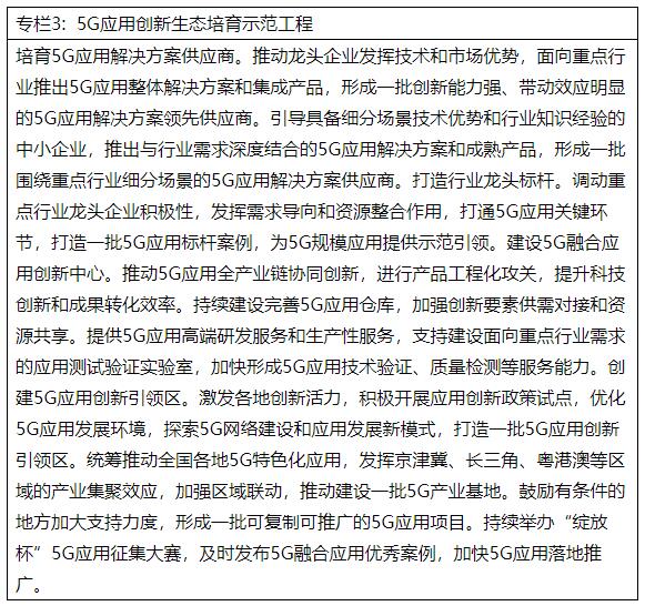 ——重点领域5G应用成效凸显。个人消费领域,打造一批“5G+”新型消费的新业务、新模式、新业态,用户获得感显著提升。垂直行业领域,大型工业企业的5G应用渗透率超过35%,电力、采矿等领域5G应用实现规模化复制推广,5G+车联网试点范围进一步扩大,促进农业水利等传统行业数字化转型升级。社会民生领域,打造一批5G+智慧教育、5G+智慧医疗、5G+文化旅游样板项目,5G+智慧城市建设水平进一步提升。每个重点行业打造100个以上5G应用标杆。
