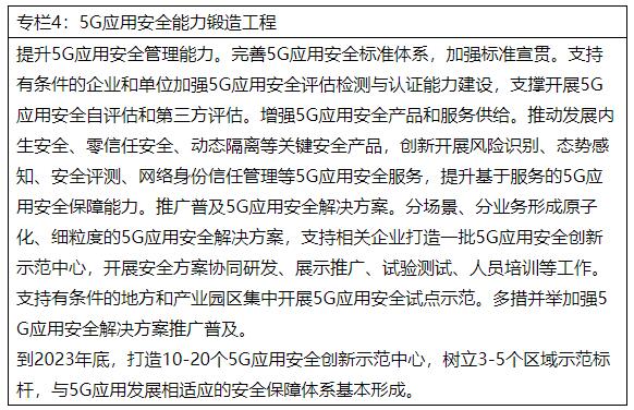 31.提升5G应用安全评测认证能力。支持与国际接轨的5G安全评测机构建设,构建5G应用与网络基础设施安全评价体系,开展5G应用与基础设施安全评测和能力认证。
