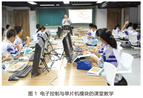 例如电子控制与单片机模块。课程涉及电子技术、控制技术、传感技术及计算机编程等内容,将硬件平台和软件程序相结合,整合物理学、电路原理、计算机等跨学科知识。课程采用开源单片机硬件平台Arduino,在便捷高效的集成开发环境中编写代码,配以多种传感器组合,实现光声电、无线控制与探测等多样化、个性化的电子控制项目方案。