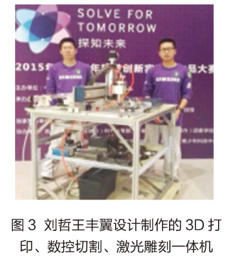 学生的兴趣与潜能都被大大激发,通过不断探索,刘哲、王丰翼两位同学还设计制作出3D打印、数控切割、激光雕刻一体机。该作品将三个系统共用一个传动系统和控制系统,采用箱式结构,使用计算机运动控制卡G代码来控制步进电机,带动滚珠丝杆转动,从而使电主轴、挤出头、激光头在三个方向均可自由移动。这个新产品不仅让电影中的面具打印机变成现实,三个系统的融合将成品的逼真效果大大提升。这种概念既节省了对于传动装置、电器系统的需求,又很大程度上节约了制造成本。该作品获得全国青年科普实验作品大赛第一名。