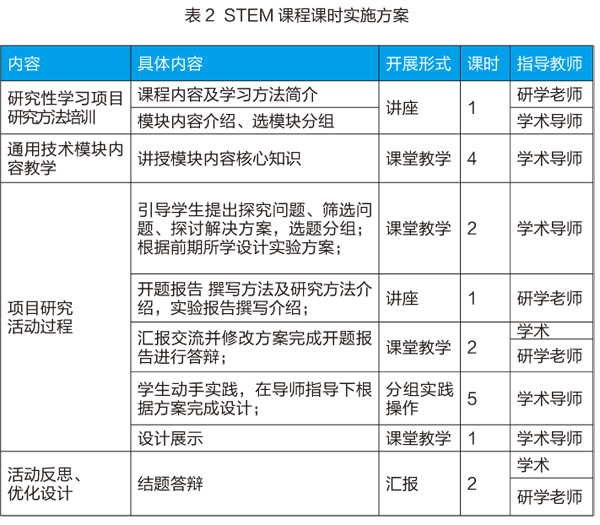 首先我们分析了STEM教育的核心特征,不难发现STEM的技术性、体验性、设计性乃至实证性与学校现有课程体系中的通用技术课有相似之处;而跨学科、协作性、情境性等又符合研究性学习的一些特点。基于此,以通用技术为切入点,将研究性学习与该课程进行整合,以项目研究的方式开展通用技术模块内容的学习,开始了第一轮的STEM教学尝试。
