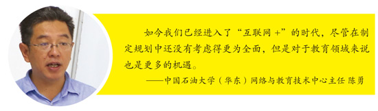 如今我们已经进入了“互联网+”的时代,尽管在制定规划中还没有考虑得更为全面,但是对于教育领域来说也是更多的机遇。习近平主席在青岛国际教育信息化大会上的贺信也指出:“因应信息技术的发展,推动教育变革和创新,构建网络化、数字化、个性化、终身化的教育体系,建设‘人人皆学、处处能学、时时可学’的学习型社会,培养大批创新人才。”