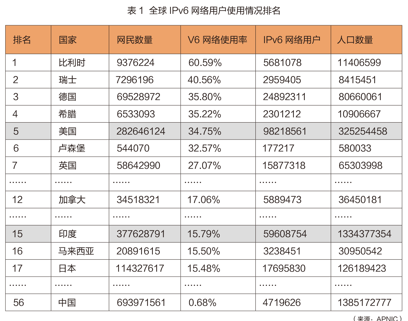 亚太地址分配组织APNIC上最新的一组数据,可以算是印证了这个打油诗的真实性,但同时也给了中国“当头棒喝”:截至2016年12月底,中国IPv6用户近500万,仅占全国互联网7亿用户的0.7%,居全球第56位。全球IPv6用户普及率最高的是比利时,超过60%,美国为34%,其IPv6用户数已达9800余万。
