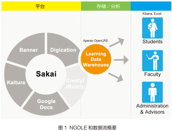 图1展示了NGDLE如何汇集起来构建起数据流,形成了丰富和多样的数据生态和脉动,并因此而实现学生学习动态数据的可视化。
