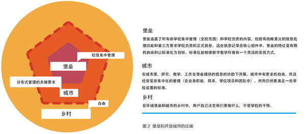 荷兰的高等院校用堡垒和开放城市模型作为比喻(如图2所示),用来确定哪些工具在学校层次管理,哪些分散管理,还有哪些不需要管理。