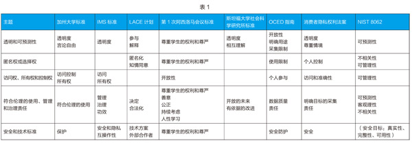 表1对每个隐私框架中的多种构成要素进行了交叉分析,将这些互不相同的方案中的相关概念归纳为五大主题。这些主题为NGDLE互操作性隐私标准建立了基础。某些隐私概念在所有的方案中都是一致的,尽管不同框架中概念的名称、重点、目标和实现途径各不相同。某个框架也许在一个主题之中有多个思路,或者将主题的基本概念归为另外一个主题中,或者根本不涉及一个主题。