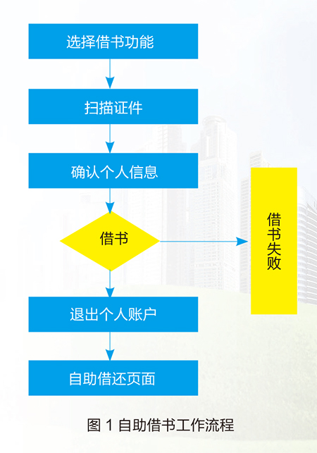 当读者办理借书手续时,系统读取借书证的相关信息,判断读者是否为合法借书者(如无超期图书、欠款等),然后提示读者将书放在指定位置,系统完成图书借出手续,对非法借书者则拒绝办理。当读者办理还书手续时,将所要归还的图书放在规定位置,系统扫描仪读取所还图书的条形码,查对所还图书有无预约书等情况,没有则办理还书手续,否则拒绝办理。自助借书工作流程如图1所示。