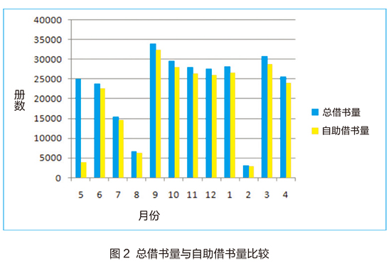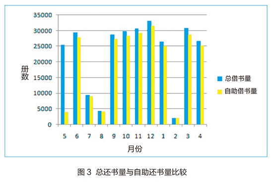 从图2、图3中可以看出,试用期的第一个月(2014年5月),由于读者对自助借还书系统不太了解,自助借还量比较小,分别为3738册和3862册。为了使读者尽快熟悉该系统,我馆在自助借还机处设置了带有图示的使用说明并安排了专人对读者进行辅导。从第二个月开始,读者利用自助借还书系统的数量显著增加,自助借还量分别达到22508册和27891册。9月的自助借书量最多为32410册,12月份的自助还书量最多为31447册。寒、暑假期间,由于我馆只在每周一、周四对外开放部分阅览室,因此2、7和8月的借还书量较少。