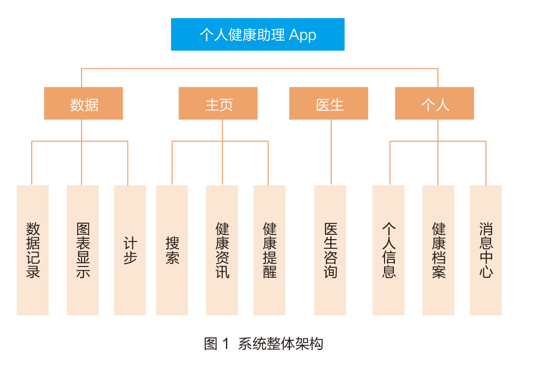 个人健康助理系统在整体功能结构上将系统分为数据、主页、医生个人四个模块,详见图1。
