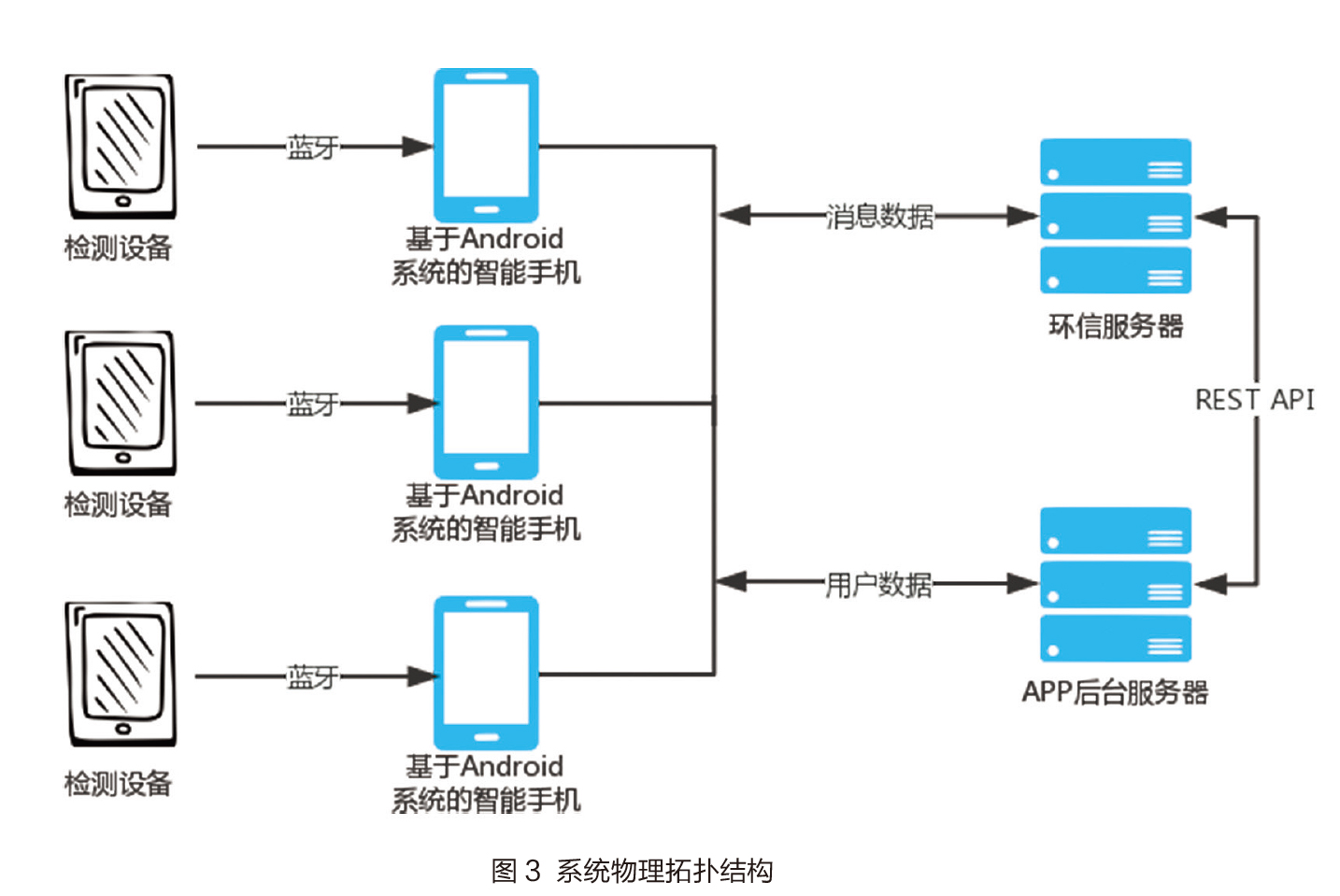 个人健康助理系统中主要有手机客户端、检测设备、App后台服务器、环信服务器四类实体。其中检测设备通过蓝牙与手机客户端连接,将数据传输至手机,手机客户端通过Http协议与App后台服务和环信服务器相连,实现数据上传至服务器。图3为系统物理拓扑结构图。