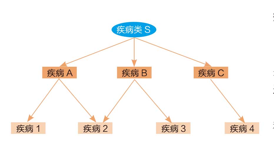 图中的叶子节点表示症状,非叶子节点表示疾病,用箭头表示因果关系,在已知节点概率以及疾病对应症状条件概率的情况下,根据症状可以计算出某些潜在疾病的概率,供用户参考。
