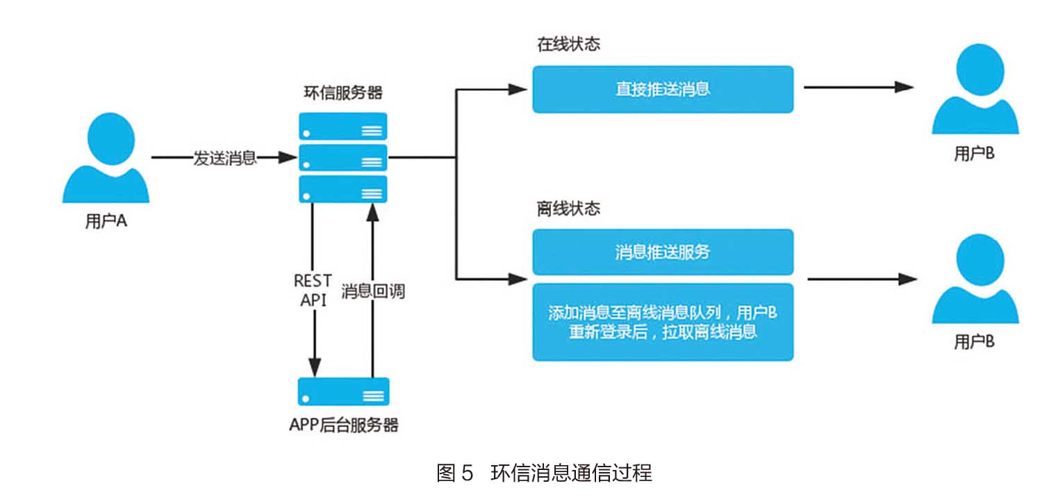 用户之间的消息传递,首先发送到环信服务器,环信服务器可将消息直接送达目标用户。同时,App后台服务器处理消息回调并通过RESTAPI返回至环信服务器。RESTAPI是一种设计风格。由于前端设备层出不穷,包括手机、平板、桌面电脑、其他专用设备等,必须要有一种统一的机制,方便前端设备与后端进行通信。由此而产生了RESTAPI。