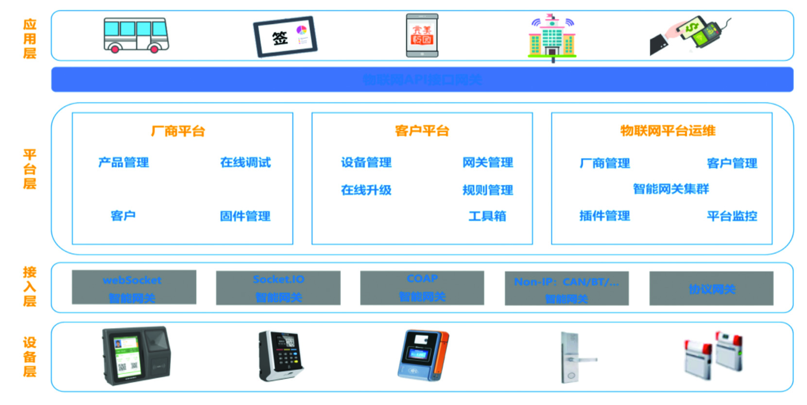 物联网服务平台是为各类一卡通外延设备提供快速接入物联网能力的平台。通过建立统一设备接入规则,实现了校园一卡通系统的软件和硬件的分离,学校可自主选择使用各类会议签到设备、人脸识别设备、通道设备等,并可以对设备进行实时监控管理。