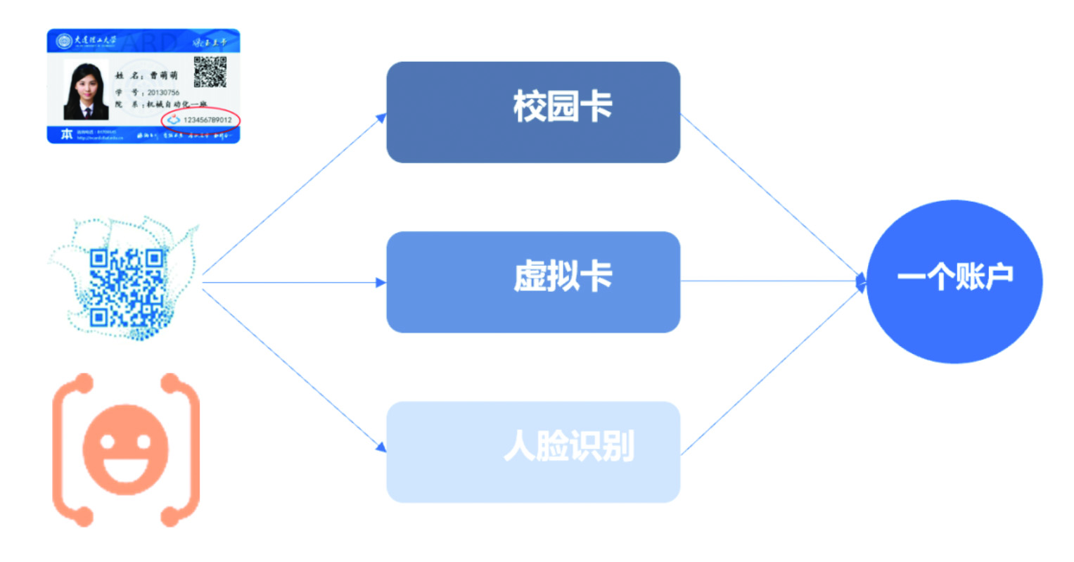 新一代一卡通系统遵循以人为中心的理念,每人开立一个基础账户,采用卡、码、脸多介质融合的统一账户管理模式,改变了传统的一人多介质多账户的模式。