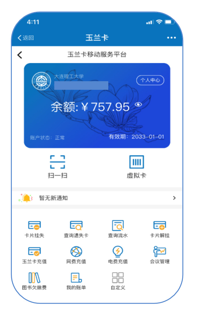 “移动服务平台”通过学校移动校园“i大工”App、“玉兰卡”微信公众号的入口,可以进入到全新的“校园卡移动服务平台”。移动服务平台功能完成了优化重组,功能分为校园自助服务类、消费充值类、自助缴费类应用等。