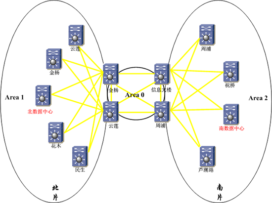 1.核心层由4台高性能路由器(NE40E-X16)组成,汇聚层由35台高性能路由器(NE40E-X8)组成,接入层由660台交换机组成,四台核心设备之间采用万兆互联,形成全网状组网,网络健壮性强、传输时延低,不会造成单点故障和传输拥塞,汇聚路由器通过2条万兆链路分别上联至各自对应的一组核心设备,以实现链路的冗余备份。通过全冗余的结构消除单点故障,以达到高可靠城域网络互联,提供永续的教育信息化业务。浦东教育城域网的网络可靠性主要采取“冗余”的思路,包括设备冗余、链路冗余、路由冗余等等来实现,通过全冗余的结构消除单点故障,充分保障整体广域骨干网络的高可靠性。华为硬件BFD探测技术,使路由、链路及设备的故障探测及切换时间都缩短到200ms以内,在任何一个节点发生的故障都会在用户不感知的情况下将业务切换到备份链路。