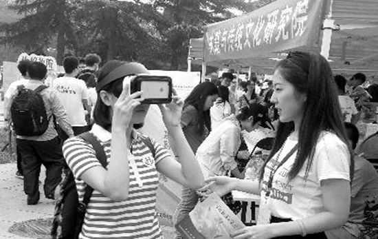 在新闻传播学院的报到现场人气显得更高,多名新生手持某公司的VR眼镜正在原地转圈体验VR虚拟现场。