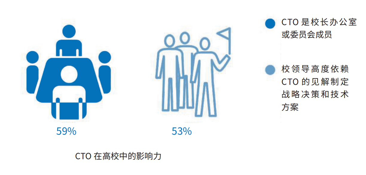 CTO表示,IT部门与学校上下各级有协作,但未发挥全部潜力。近五分之三的CTO(59%)在所在院校担任校长行政办公室或理事会成员。近半数(53%)的CTO表示,校领导在涉及技术的战略决策和规划中高度依赖他们的知识和见解。多数CTO(90%)认同,IT部门已找到有效方式与校内其他部门建立联系并开展合作。仅四分之一(26%)的CTO认为IT部门存在壁垒,限制了影响力。87%的CTO表示热爱本职工作,并愿意鼓励后辈选择相同的职业道路(81%)。