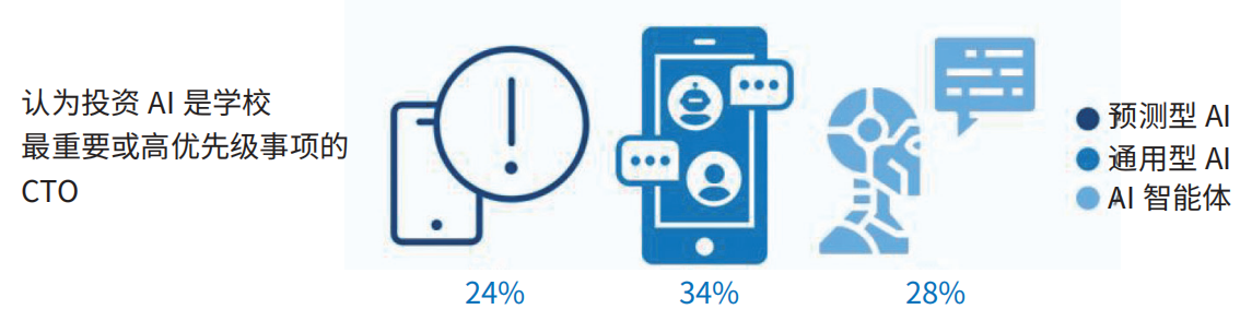 与其他部门就AI问题的协同沟通相对顺畅。三分之二的CTO(66%)同意,IT与教务部门之间存在有效的沟通渠道,可就AI政策及其他关键议题展开协作。63%的受访者表示,学校领导正积极参与AI相关讨论并认为此事至关重要。但仅35%的CTO认为所在学校正在妥善应对AI的崛起,只有19%的CTO认为整个高等教育正在应对AI的崛起。同时,32%的CTO部分认同,所在大学对AI的依赖程度较前一年有显著提升。学校应用AI的主要领域是网络安全(51%)和虚拟助手及聊天机器人(49%),其中公立大学的CTO尤其倾向于后者。