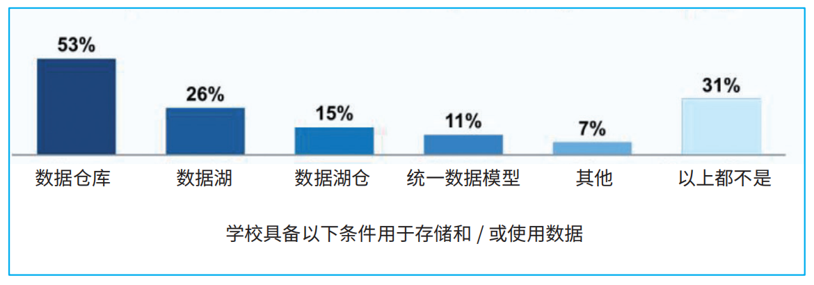 利用数据促进学生成功。超半数CTO表示,学校在以下方面进展良好:有效运用数据支持学生成功(60%),有效运用数据指导重要决策(56%),建立支持分析需求的数据职能架构(52%),将数据分析列为战略重点(52%)。36%的CTO认为学校采取了积极的措施营造数据文化。关于数据存储方式与位置,53%的CTO表示拥有数据库,26%的CTO表示拥有数据湖。仅11%的高校采用统一数据模型,可减少数据孤岛并提升数据治理水平。