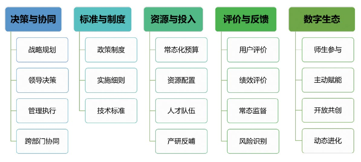 数字化工作保障可以从多个维度进行梳理,形成结构清晰的框架体系,如图1所示。决策与协同是顶层驱动,包括战略规划、领导决策、管理执行和跨部门协同等,从战略指引和行动统筹两个层面保障数字化工作的系统性与一致性。标准与制度作为运行准则,通过建立健全技术标准、管理规范与指导性政策,为各类数字工作提供规范、可操作的依据。资源与投入是数字化工作的重要支撑,通过合理的预算安排与资源配置,确保在人、财与物方面持续投入,夯实数字化能力基础;同时,推动数字化创新成果产生产研效应,形成反哺学校的能力,也是行之有效的路径。评价与反馈聚焦过程与成果评估,通过建立绩效评价体系与用户评价机制,以评促建,结合常态化监督与风险识别,推动数字化工作动态调整、螺旋上升。培育数字生态是面向未来的发展阶段,旨在形成师生参与、开放共创的数字文化与主动赋能、动态进化的核心能力,为学校数字化转型提供创新动力。