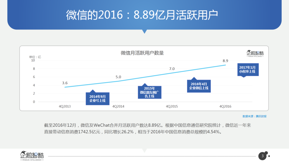 微信用户群较大。2017年4月24日,腾讯旗下的企鹅智酷公布《2017微信用户&生态研究报告》。根据这份报告数据显示,截止到2016年12月微信全球共计8.89亿月活用户,而新兴的公众号平台拥有1000万个。微信这一年来直接带动了信息消费1742.5亿元,相当于2016年中国信息消费总规模的4.54%。如图1、2016年微信用户活跃度。