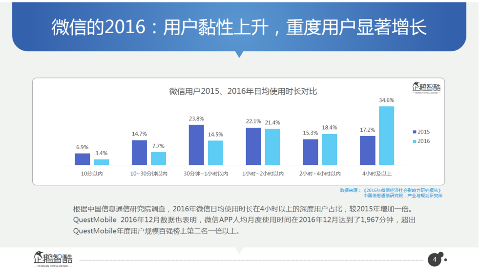 用户粘度高。《2017微信用户&生态研究报告》:微信活跃用户方面,2016年日均使用微信市场在4小时以上的用户较2015年增加了一倍,第三方数据显示微信APP人均月度使用时间在2016年12月达到了1967分钟,超出第二名一倍以上。如图2、2016年微信用户粘性趋势。