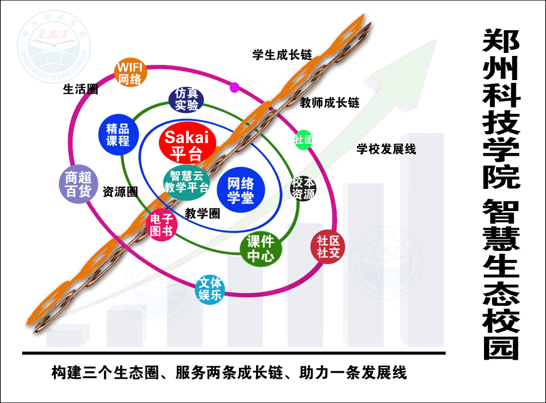 建设初期最忌讳大而全,因此我们考虑按照我校“三圈两链一主线”(三圈是指生活圈、学习圈、资源圈;两链是指教师成长链,学生成才链;一主线是指学校科学发展的主线。如图3、郑州科技学院智慧生态校园建设模型)信息化建设模式,先行对生活圈相关服务进行梳理,建立原型系统,上线测试,根据反馈,快速迭代,及时发布,即插即用,即时生效。